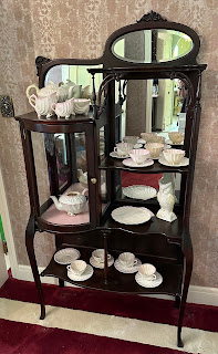 China galore! Royal Albert Blossom Time (with rare pieces like egg cups and coffee pot), lots of Limoges, Chintz, Wedgwood Jasperware, Lantiernier Limoges, Coalport Sandringham, Johnson Brothers Athens, Franciscan, Indian Tree, and many others. HUGE teacup collection (including Shelley!). Glassware of all kinds including crystal stemware, Waterford, collection of LE Smith Moon and Stars in several colors, blue and white milk glass, pottery, stoneware, decorative pieces, brass, crystal lamps.